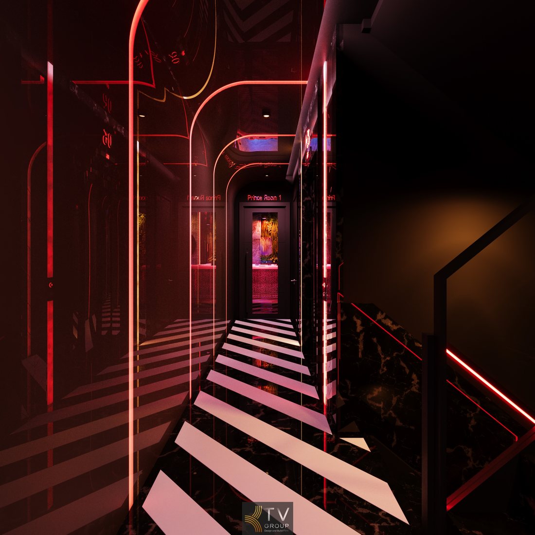Điểm nổi bật của hành lang trong hình là việc sử dụng hệ thống ánh sáng LED tím kết hợp đèn hắt trần uốn cong liên tục, tạo hiệu ứng dẫn hướng thị giác rất mạnh. Ánh sáng không quá chói mà được điều tiết vừa đủ, mang lại cảm giác dễ chịu và sang trọng. Bên cạnh đó, các chi tiết hình học lặp lại trên trần và sàn giúp tăng chiều sâu không gian, khiến hành lang trở nên dài và cuốn hút hơn.