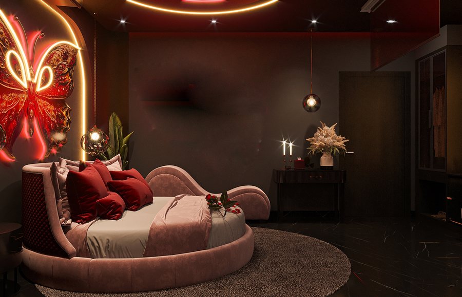 Không gian phòng được xây dựng theo phong cách Luxury Modern Romantic, phối hợp các gam màu đỏ – nâu ấm để tạo cảm giác thư giãn và sang trọng. Tâm điểm nổi bật nhất của căn phòng là mảng trang trí nghệ thuật hình hồ điệp, được thiết kế với hiệu ứng ánh sáng LED bao quanh, làm nổi bật từng đường nét tinh xảo và biểu trưng cho sự tự do – tinh tế.