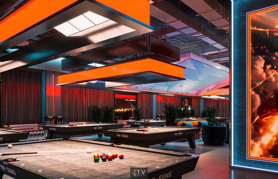 Khu bida được thiết kế theo phong cách lounge cao cấp, nổi bật với hệ trần LED khối lớp mạnh mẽ, gam màu cam – đen – xanh tương phản đầy cá tính. Các bàn bida bố trí thẳng hàng, khoảng cách rộng, ánh sáng tập trung chuẩn mặt bàn giúp tăng trải nghiệm chơi. Không gian kết hợp rèm tối, sofa thư giãn và decor ánh sáng viền tạo cảm giác sang trọng, hiện đại, phù hợp mô hình giải trí đêm, thu hút giới trẻ và khách hàng cao cấp.