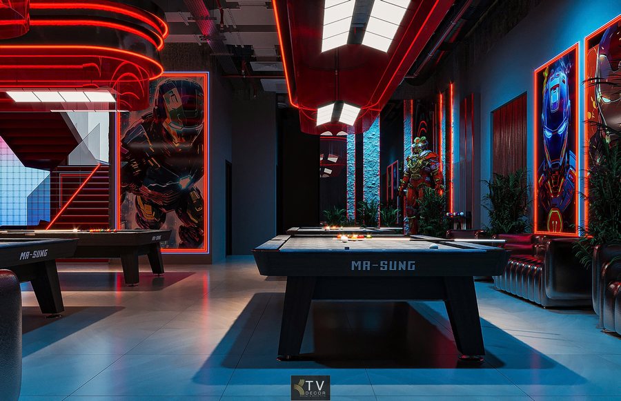 Thiết kế trong hình ứng dụng rõ rệt tư duy bida kết hợp trải nghiệm công nghệ. Hệ trần LED tạo hình khối, đèn rọi tập trung từng bàn, tranh décor sci-fi – nhân vật công nghệ giúp không gian mang tính nhận diện mạnh. Công năng được tối ưu cho vận hành liên tục: ánh sáng không gây chói, âm thanh kiểm soát tốt, lối đi rộng, ghế chờ bố trí hợp lý giúp người chơi thoải mái dù ở lại trong thời gian dài.