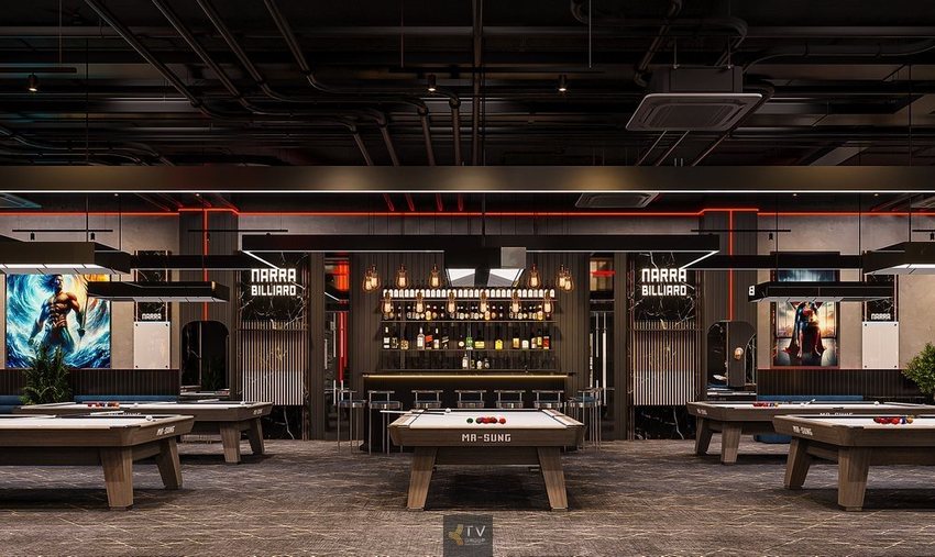 Sàn trải thảm họa tiết hình học giúp giảm ồn, tăng độ êm chân và định hướng lối đi rõ ràng. Tường trang trí bằng tranh nghệ thuật khổ lớn, kết hợp cây xanh bố trí hợp lý, cân bằng giữa cảm giác thể thao và giải trí cao cấp. Tổng thể không gian mang lại trải nghiệm billiards chuyên nghiệp, hiện đại, phù hợp mô hình kinh doanh trung tâm giải trí cao cấp tại đô thị.