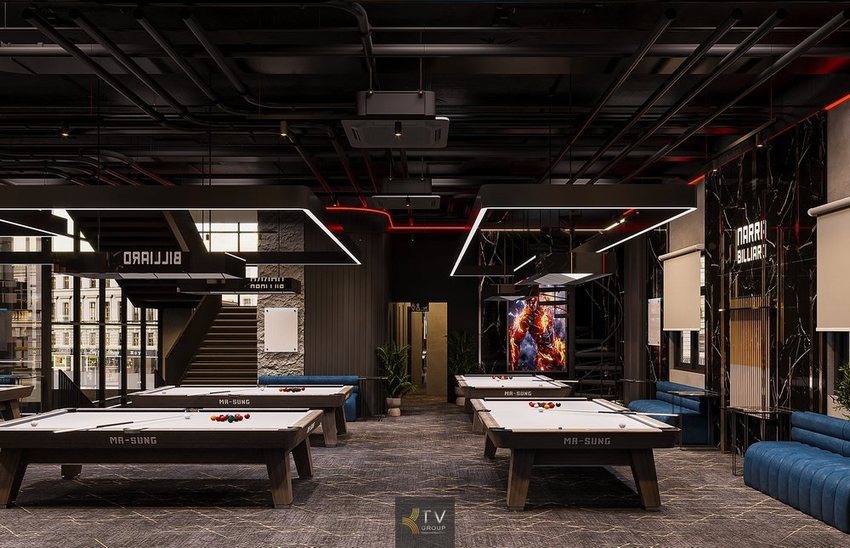 Trần được xử lý theo dạng trần mở kỹ thuật, lộ hệ thống ống gió, điện, điều hòa, sơn tông tối. Phong cách này không chỉ tiết kiệm chi phí thi công mà còn tạo cảm giác mạnh mẽ, nam tính, rất phù hợp với không gian thể thao giải trí như Billiards.