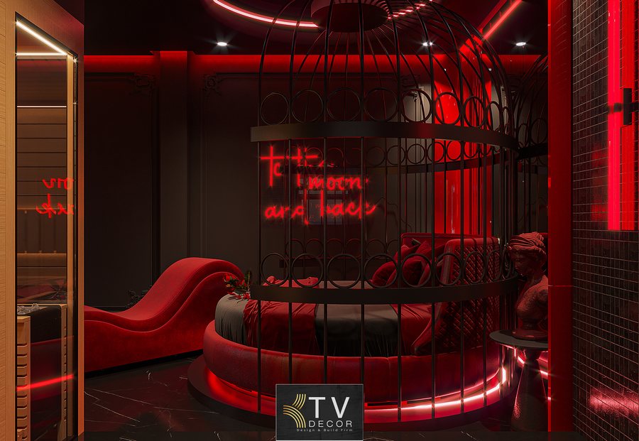 Phong cách: Hiện đại – ánh sáng đỏ – chi tiết kim loại cong nghệ thuật
