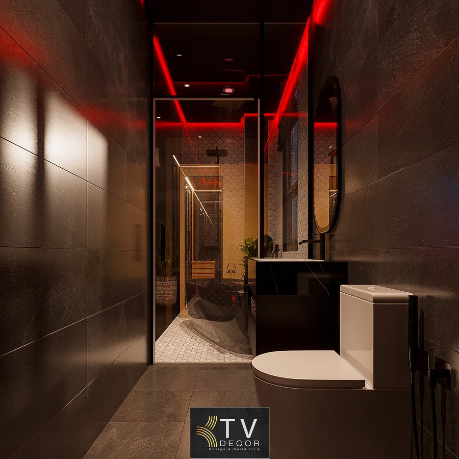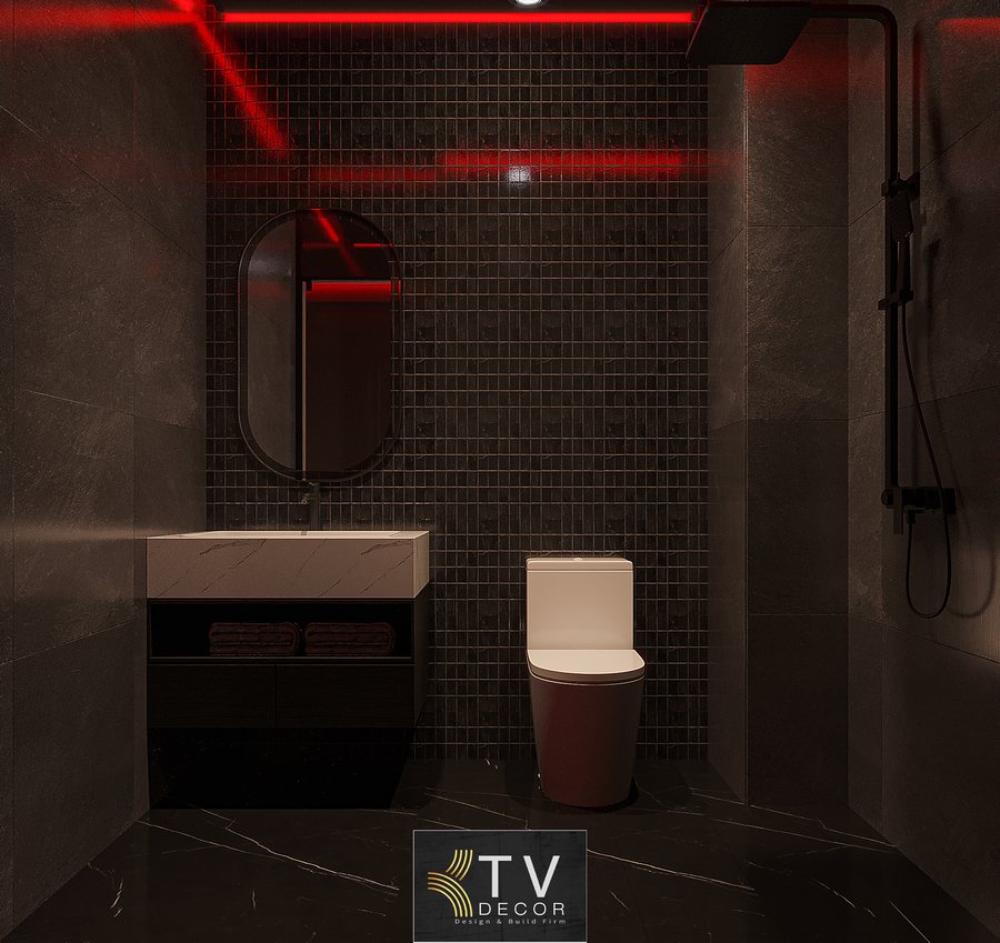 Không gian nổi bật với tông đỏ đen làm chủ đạo, tạo nên sự ấm áp và chiều sâu thẩm mỹ. Thiết kế chú trọng vào ánh sáng LED dạng hắt viền, kết hợp đường cong nội thất để mang lại cảm giác cao cấp và khác biệt.