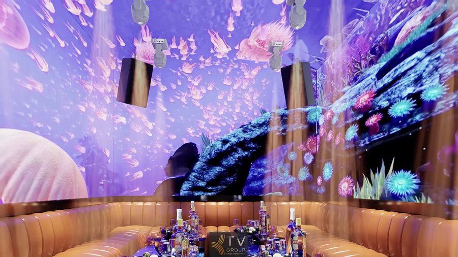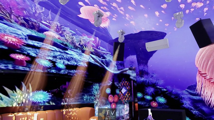 Không gian tổng thể sử dụng màn hình LED full tường, tạo hiệu ứng đại dương bao quanh toàn bộ phòng