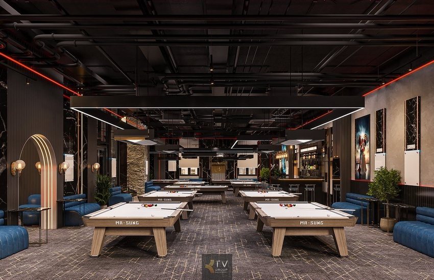 Khu Billiards “Central Line Arena” tầng 2 diện tích 350m² được thiết kế theo trục trung tâm, tối ưu ánh sáng, công năng và trải nghiệm giải trí thể thao cao cấp,Thiết kế thi công khu Billiards tại NARRA BILLIARDS Bình Thạnh mang phong cách Industrial, trần mở, đèn treo bàn chuyên nghiệp, tối ưu công năng và trải nghiệm người chơi. (Lượt xem : 64 )