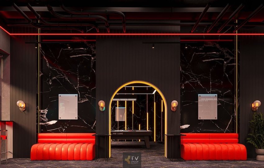 Khu ngồi theo dõi đánh bida tại tầng 1 NARRA BILLIARDS được thiết kế như một không gian đệm thông minh giữa thi đấu và giải trí. Bố cục ghế băng dài ôm tường kết hợp lối vòm trung tâm giúp khách vừa quan sát toàn bộ bàn bida, vừa thư giãn, trò chuyện mà không ảnh hưởng đến người chơi. Thiết kế theo xu hướng nightlife – industrial hiện đại, sử dụng ánh sáng LED viền đỏ, vật liệu tối màu và nhấn cong kiến trúc, tạo nên không gian linh hoạt cho cả xem thi đấu, chờ lượt chơi hoặc nghỉ ngơi giữa các trận.