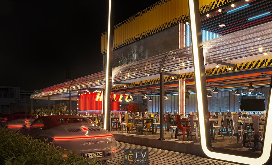 Dự án Beer Food Garden diện tích khoảng 1000m² như hình minh họa là mô hình tiêu biểu cho xu hướng này: ngoại thất nổi bật – nội thất công nghiệp hiện đại – ánh sáng nhận diện mạnh – bố cục không gian mở linh hoạt, giúp tối ưu công suất khai thác và doanh thu theo thời gian.