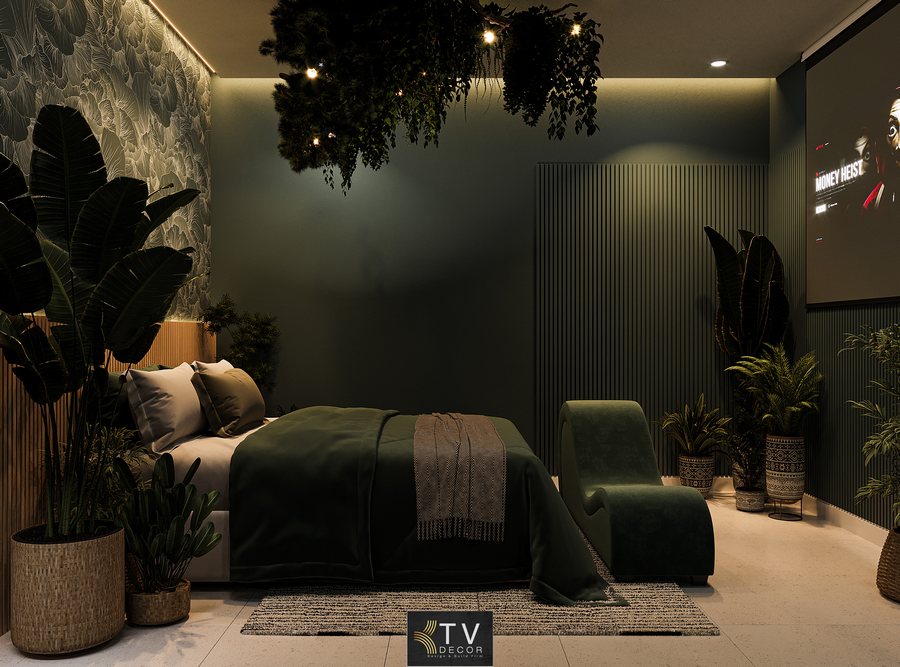Tường đầu giường họa tiết lá Tropical được chiếu hắt sáng tạo chiều sâu.