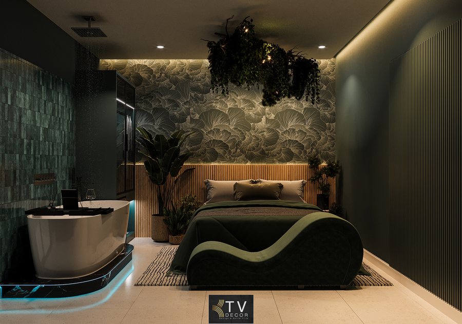 Thiết kế thi công phòng khách sạn chủ đề tình yêu phong cách Tropical Sang Trọng, ứng dụng ánh sáng ấm và vật liệu xanh cao cấp mang lại trải nghiệm thư giãn đẳng cấp.