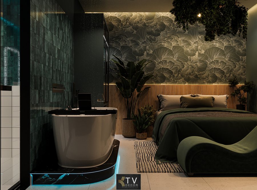 Bồn tắm đặt cạnh giường, thiết kế bệ đá đen vân xanh với đèn LED chân bệ tạo hiệu ứng nổi.